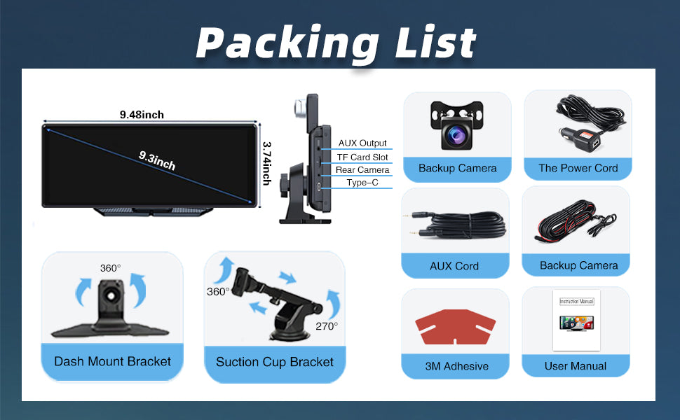 - 【4K HD Recorder】This 9.3 Inch Portable Screen for Car is equipped with a 4K front video (360° rotatable) and a 1080p rear camera, which can record every detail clearly in day or night, and monitor the real-time picture on your CarPlay Screen!